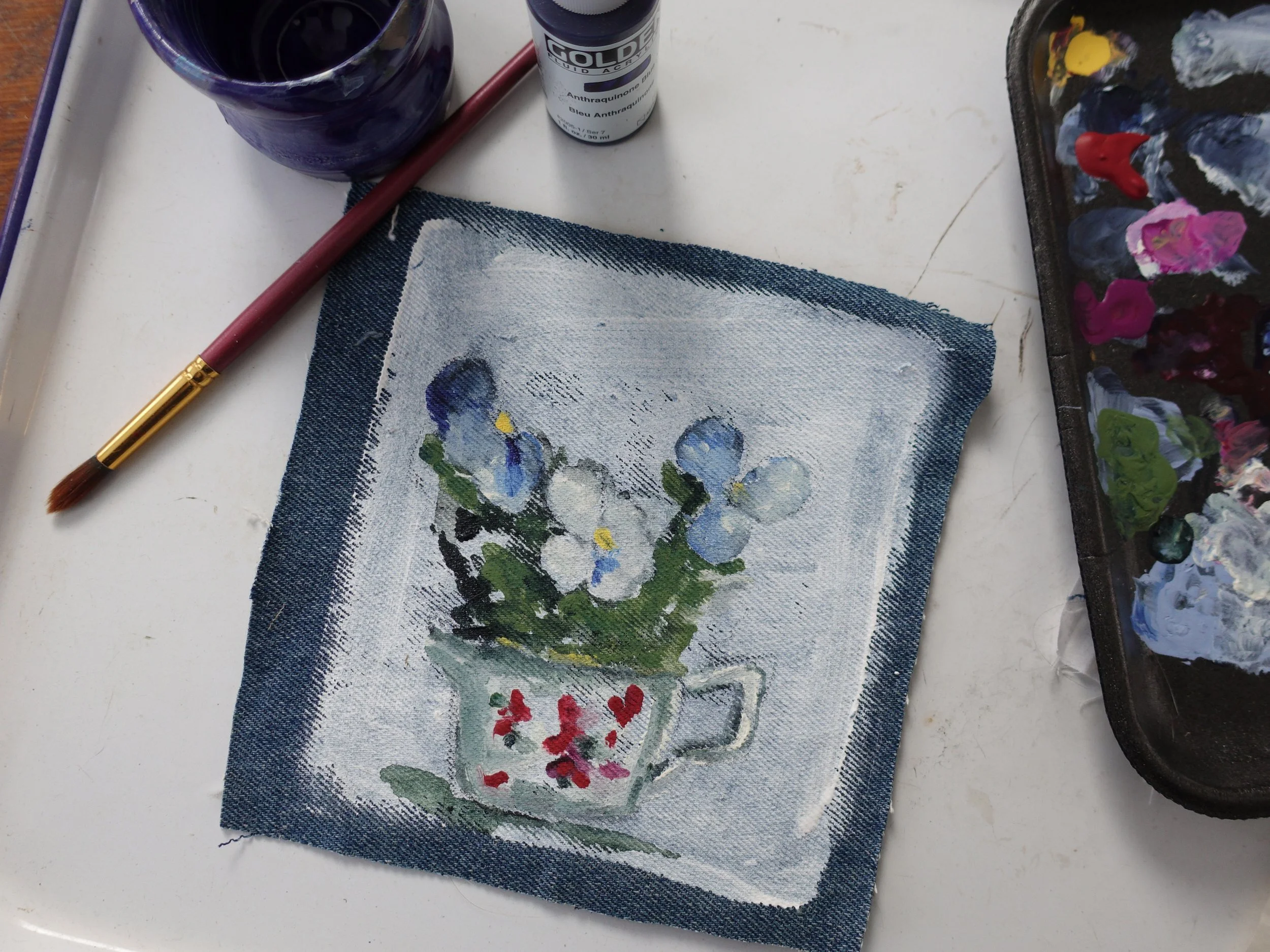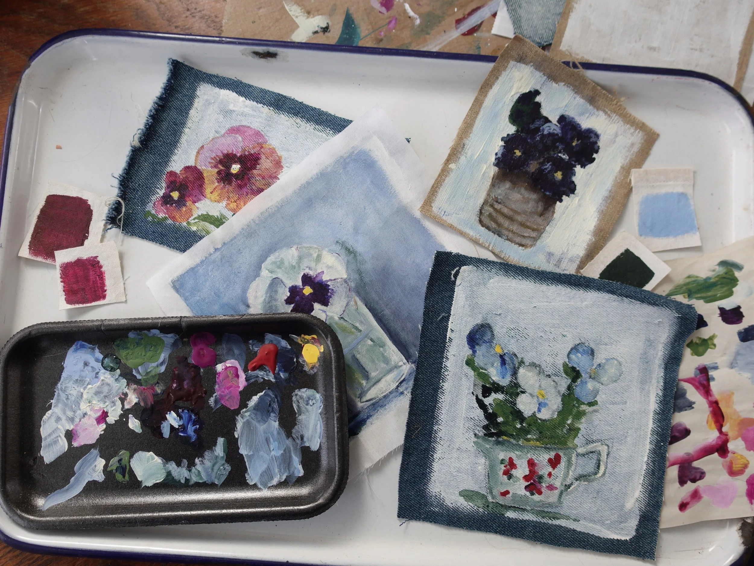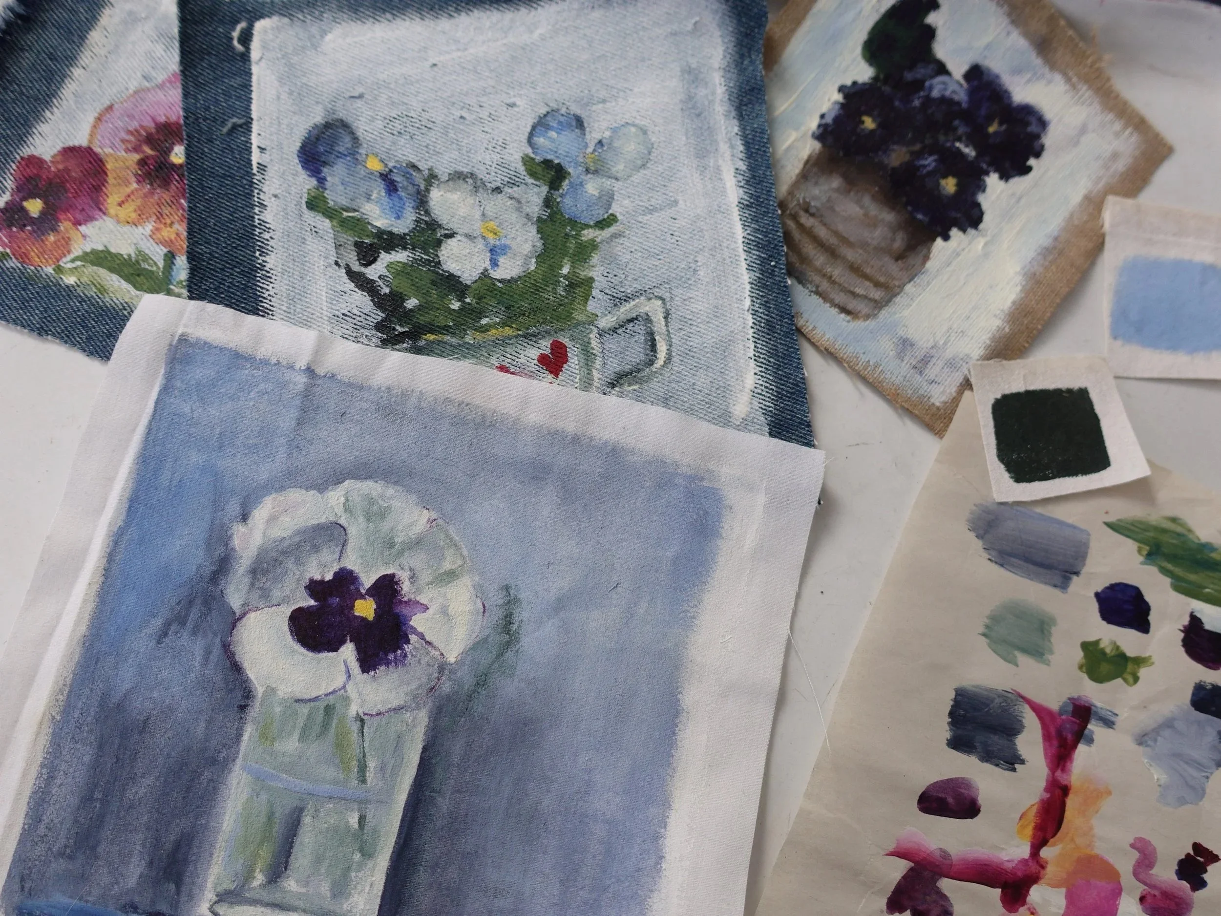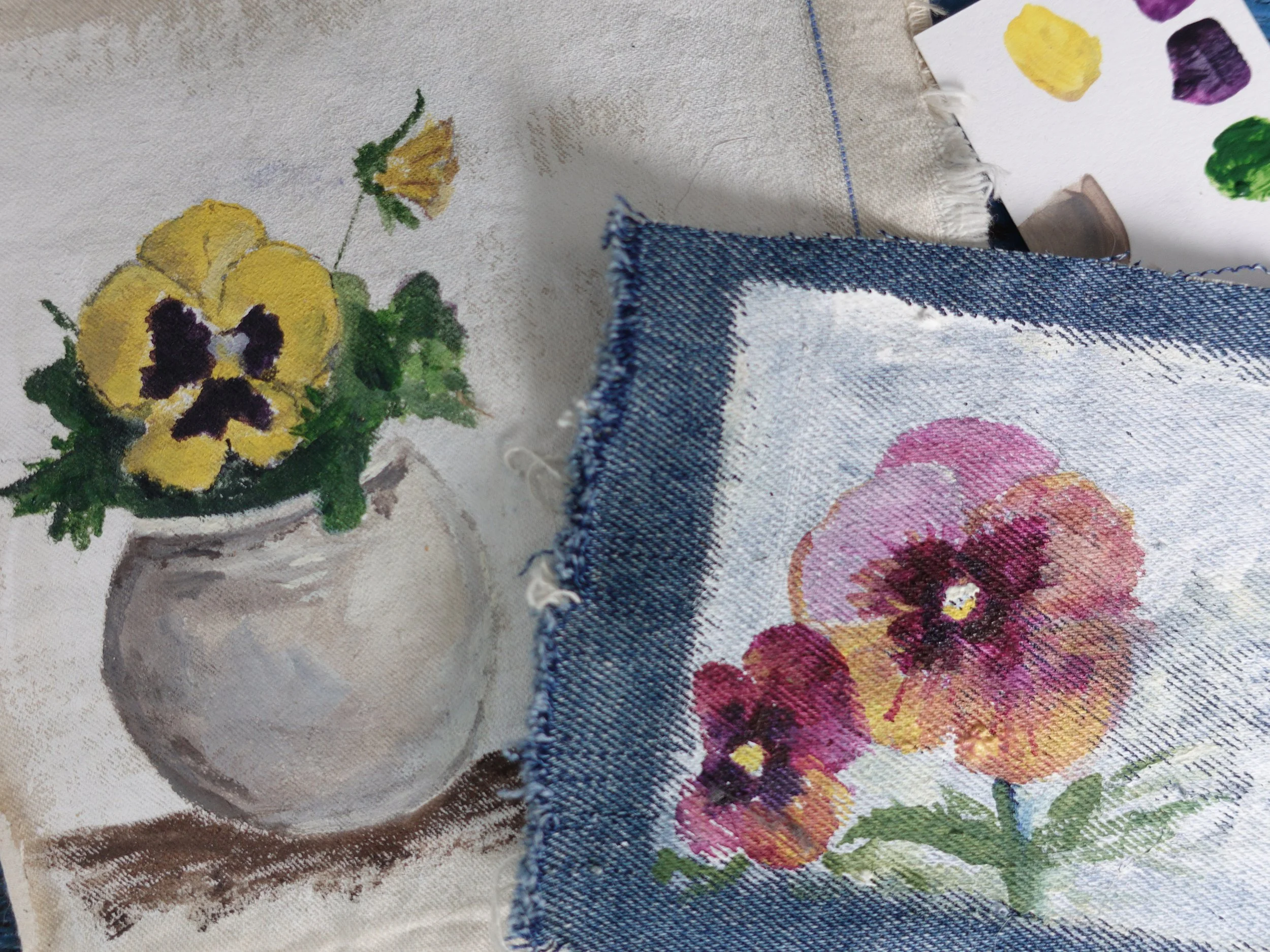 In this workshop, you will learn how to mix colors and make color swatches using acrylic paint. We will be using real pansies to inspire our art, loosely sketching our flowers and then painting them on salvaged fabric!