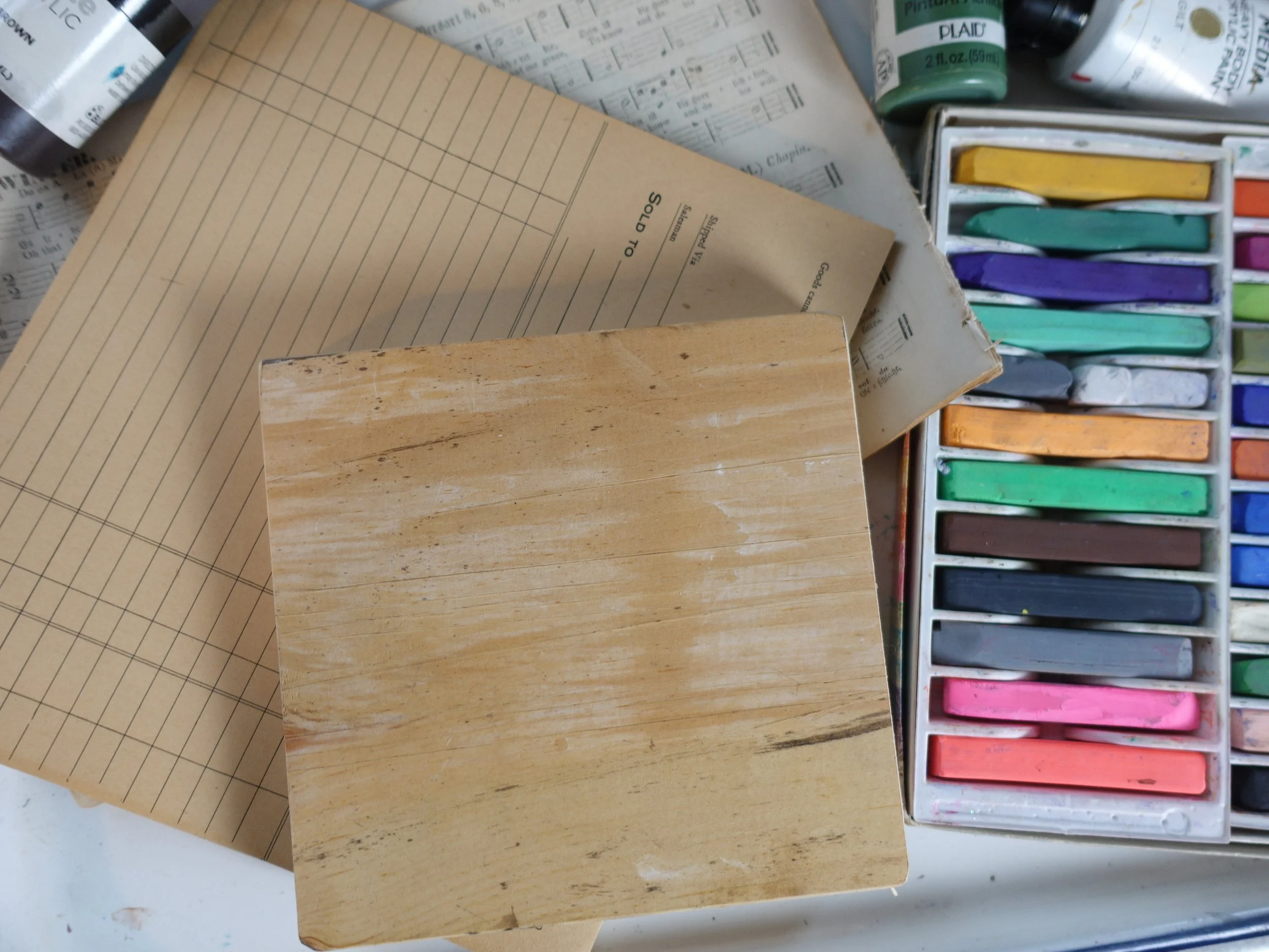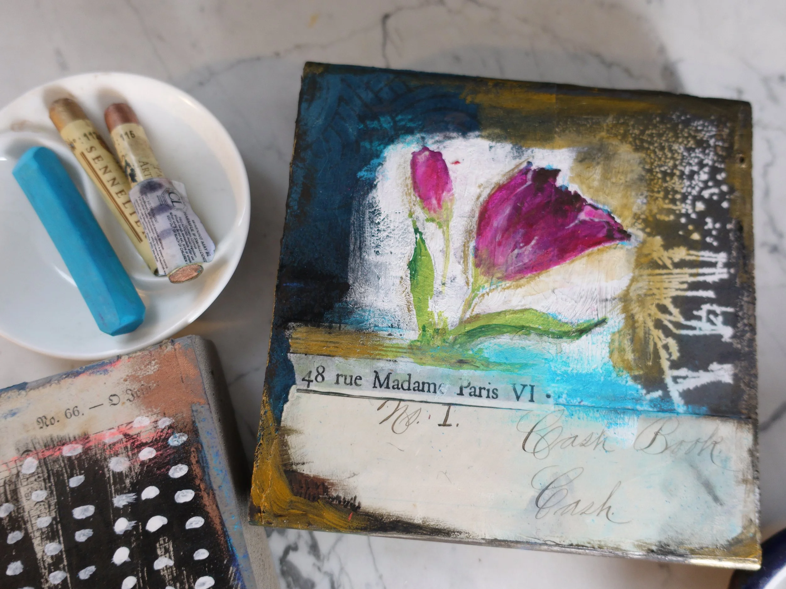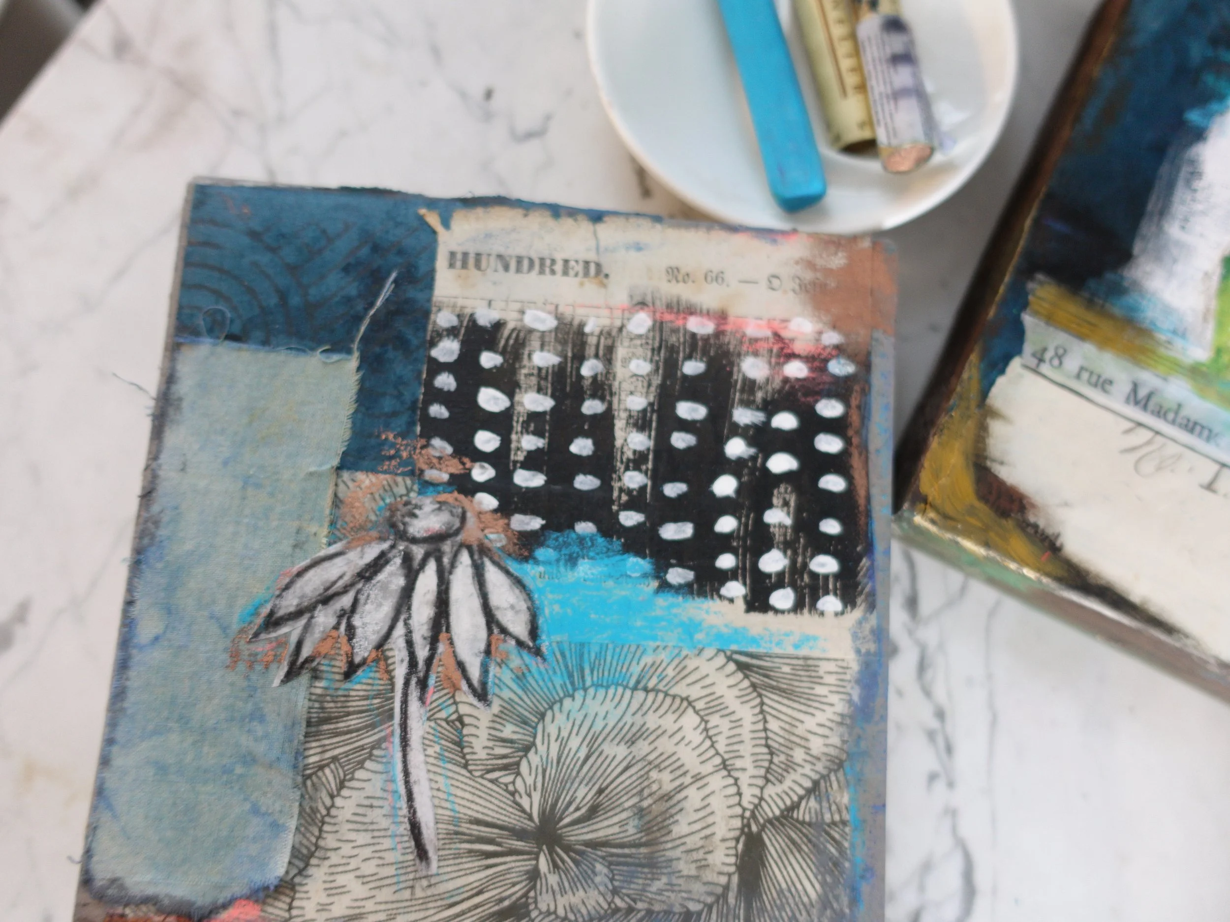 Create a trio of collage/mixed media artworks on salvaged boards